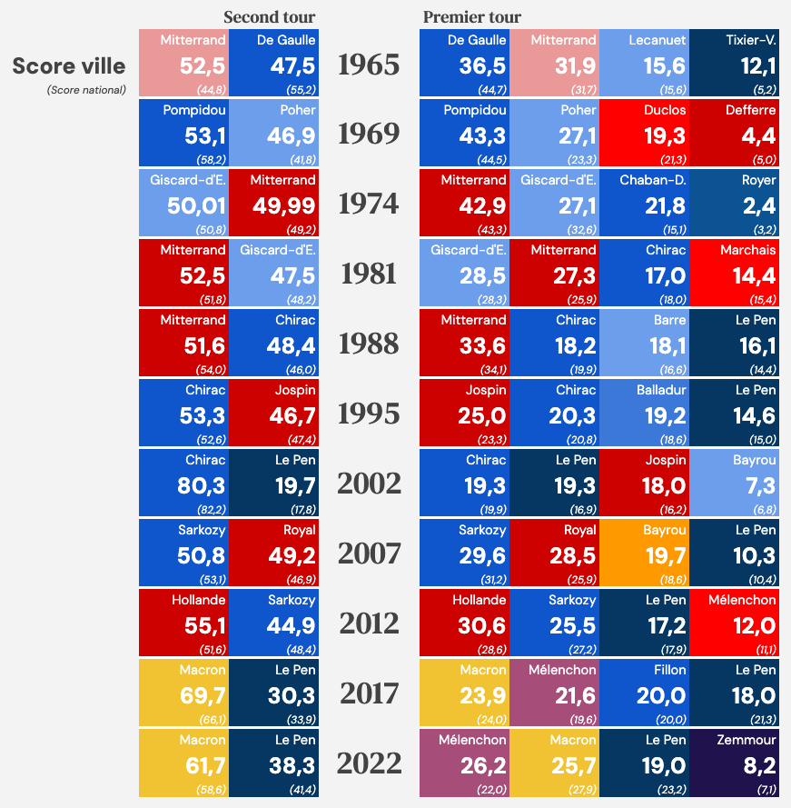 Saurez-vous reconnaître quelle ville se cache derrière les résultats des onze élections présidentielles de la Ve République ? Le principe est simple, la réponse beaucoup moins.