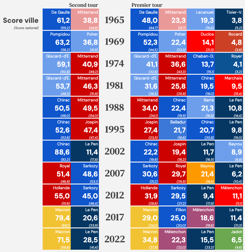 Saurez-vous reconnaître quelle ville se cache derrière les résultats des onze élections présidentielles de la Ve République ? Le principe est simple, la réponse beaucoup moins.