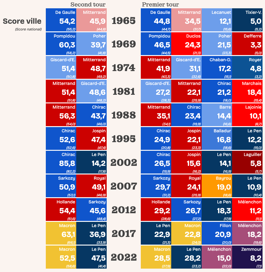 Saurez-vous reconnaître quelle ville se cache derrière les résultats des onze élections présidentielles de la Ve République ? Le principe est simple, la réponse beaucoup moins.