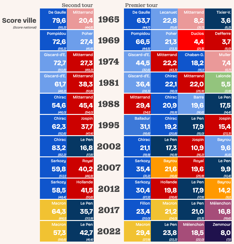Saurez-vous reconnaître quelle ville se cache derrière les résultats des onze élections présidentielles de la Ve République ? Le principe est simple, la réponse beaucoup moins.