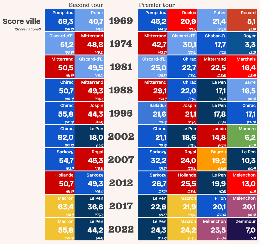 Saurez-vous reconnaître quelle ville se cache derrière les résultats des onze élections présidentielles de la Ve République ? Le principe est simple, la réponse beaucoup moins.
