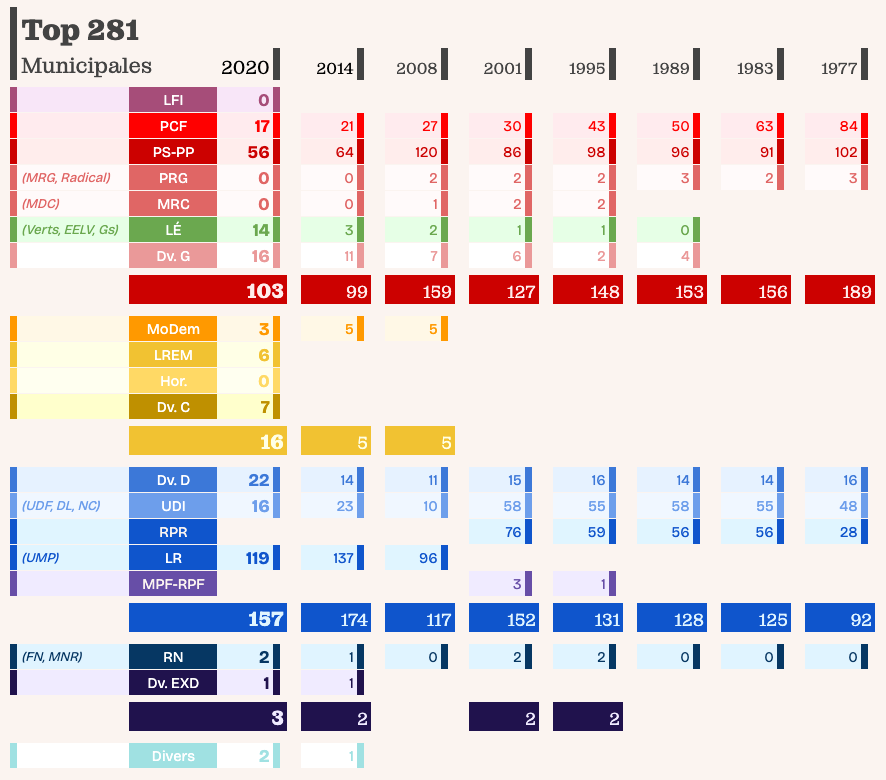 Dans cette France là, quel était l’état des forces en 2020 ? 103 communes avaient un maire de gauche (17 PCF, 55 PS, 13 EELV, 1 Générations, 1 Place publique, 16 divers gauches) ; 16 avaient un maire du bloc central (3 MoDem, 6 LREM, 7 divers centre) ; 157 un maire de droite (16 UDI, 119 LR, 22 divers droite) ; 3 un maire d’extrême droite (dont 2 RN) ; deux maires étaient inclassables.
