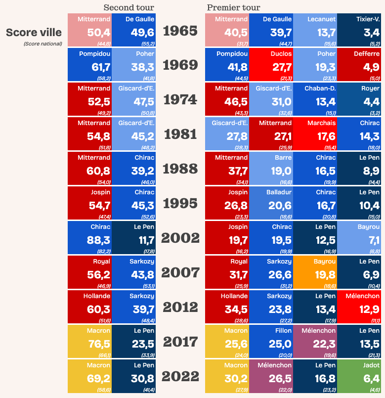 Saurez-vous reconnaître quelle ville se cache derrière les résultats des onze élections présidentielles de la Ve République ? Le principe est simple, la réponse beaucoup moins.