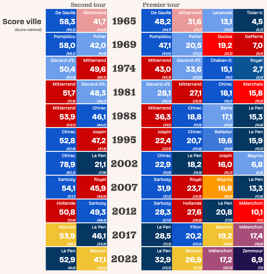 Saurez-vous reconnaître quelle ville se cache derrière les résultats des onze élections présidentielles de la Ve République ? Le principe est simple, la réponse beaucoup moins.