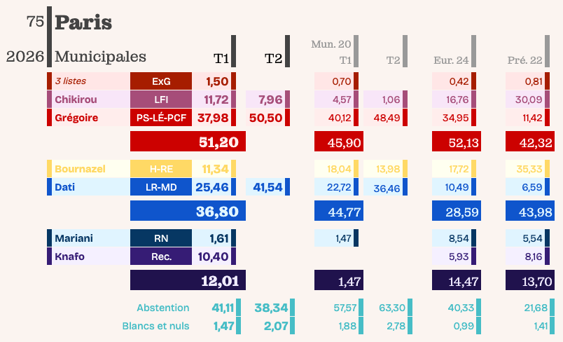 C’est un triomphe pour Emmanuel Grégoire (PS-Ecologistes-PCF). Gagner, avec la majorité absolue des voix, dans une triangulaire avec une autre liste de gauche… C’est très, très fort. Sa liste est en tête - et à chaque fois avec plus de 50 % des voix - dans 11 secteurs sur 17. Delanoë n’a jamais fait mieux que 12/20, même lors de sa réélection triomphale de 2008. C’est à marquer d’une pierre blanche dans l’histoire de la gauche parisienne.